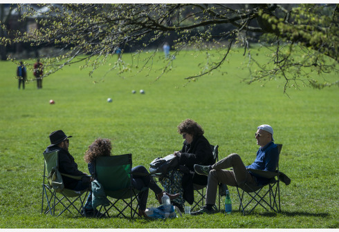 人们在英国伦敦的报春花山享受阳光