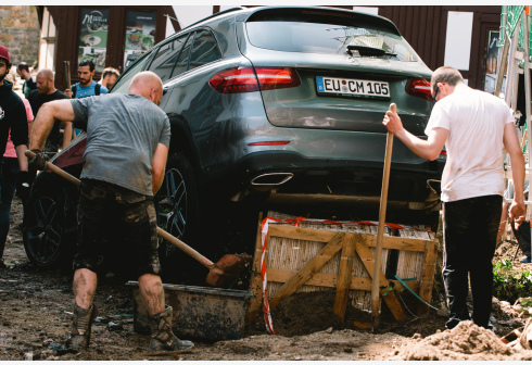 在德国西部城镇巴特明斯特艾弗尔,人们清理洪水损毁的街道