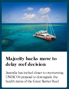 澳洲政府近日已成功游说世界遗产委员会的大部分国家支持推迟联合国教科文组织(UNESCO)将大堡礁列入“世界濒危遗产”的提案。