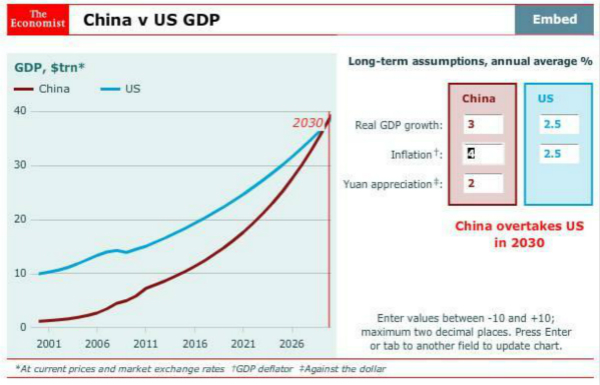 《经济学人》的预测较为保守,估计中国经济总量可能会在2030年赶上美国。