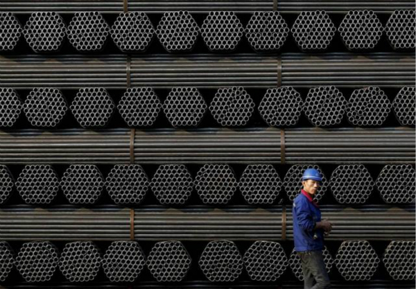 2015年11月,唐山,一名工人经过堆积如山的钢管旁。