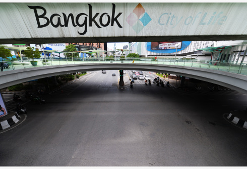 在泰国曼谷拍摄的人流稀少的街道。泰国新冠肺炎疫情管理中心22日通报,新增13655例新冠肺炎确诊病例,再创单日确诊数量新高。同日新增死亡病例87例。截至当天,泰国