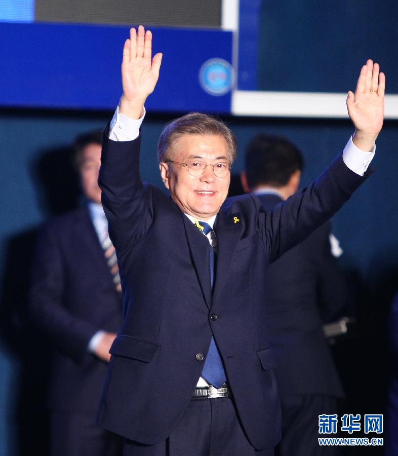 5月9日,文在寅在韩国首尔光化门广场向支持者致意。韩国中央选举管理委员会10日凌晨发布的数据显示,共同民主党候选人文在寅确认在韩国第19届总统选举中获胜,当选韩