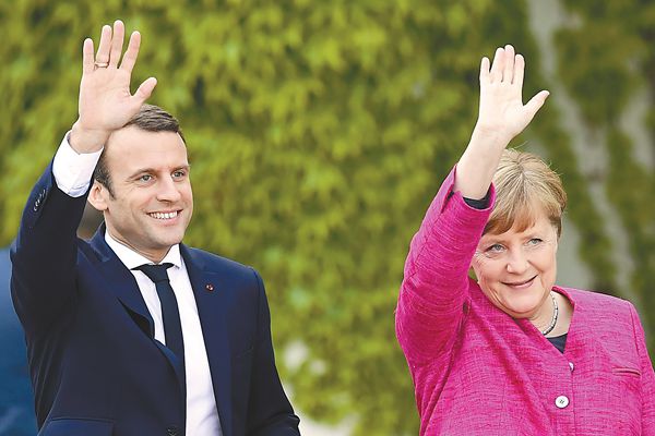 当地时间15日,在德国首都柏林,德国总理默克尔与到访的新任法国总统马克龙向群众挥手致意。德国《图片报》16日称,法国新任总统马克龙15日傍晚前往柏林与德国总理默