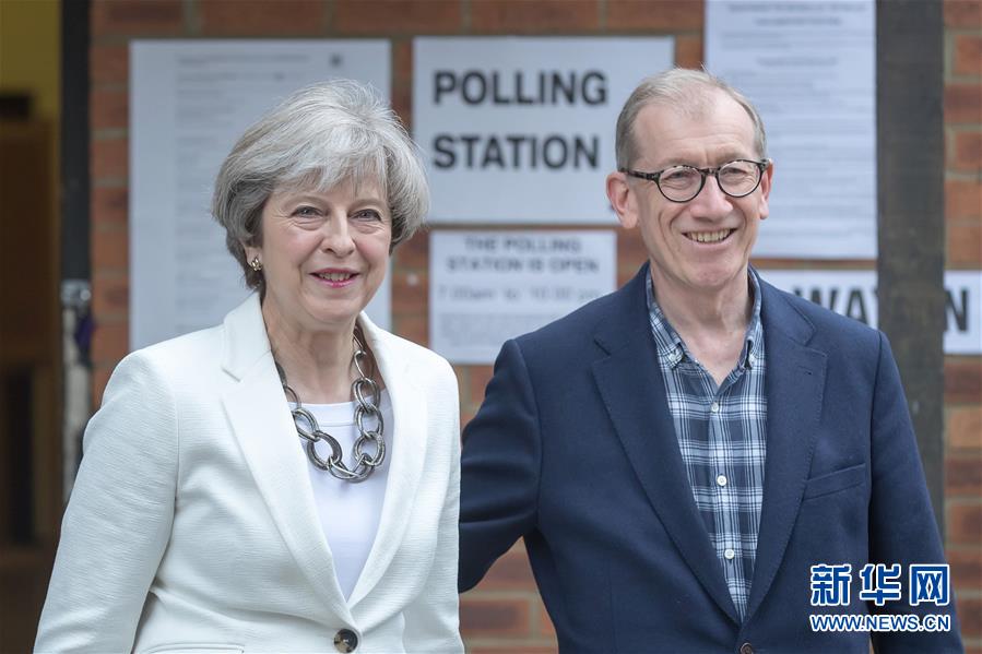6月8日,在英国桑宁,英国首相、保守党领导人特雷莎·梅及丈夫投票后从投票站走出。当地时间8日上午7时,英国大选投票开始。这是去年6月英国公投决定“脱欧”后举行的