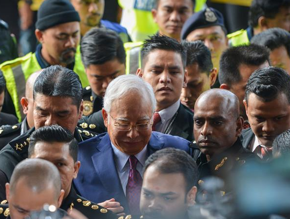 7月4日,在马来西亚吉隆坡,前总理纳吉布(中)抵达法院。马来西亚前总理纳吉布4日被检方提起公诉,罪名为贪污和背信罪,但纳吉布否认有罪。新华社发(张