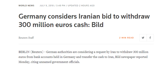 据路透社9日报道,德国相关部门正在考虑伊朗方面拟提取存在德国的3亿欧元现金并将其运回伊朗的要求。路透社报道截图据路透社报道,德国《图片报》援引不具名的政府