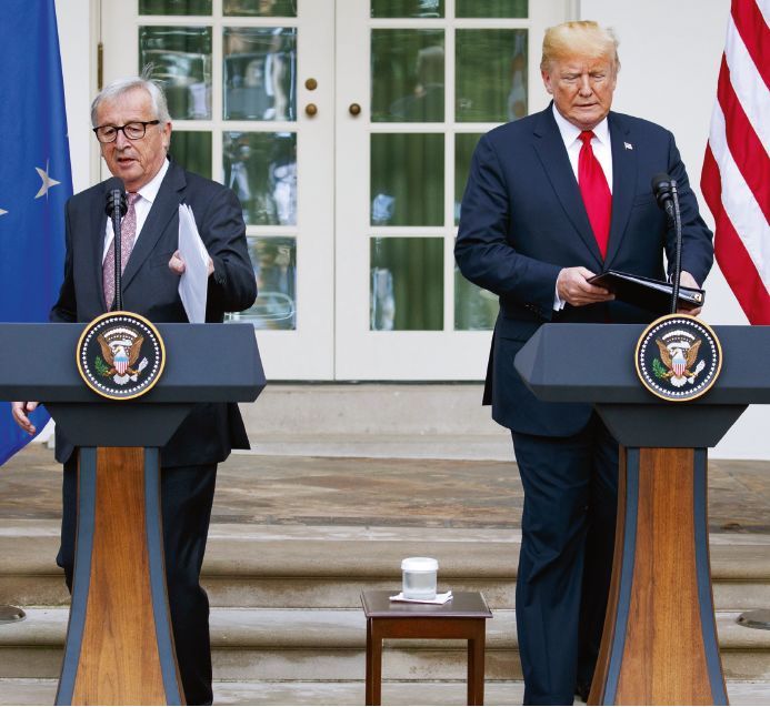 知识产权、国内补贴和竞争政策将成为新一代国际贸易体系中的重要规则7月25日,在美国华盛顿白宫,美国总统特朗普(右)和欧盟委员会主席容克出席联合记者会。图/新华
