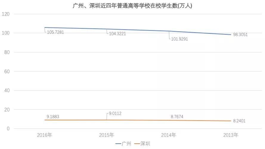 从上图中可以看出,广州2016年高等学校在校生数量是深圳的11.5倍,而且近4年,深圳的在校生增速也低于广州。