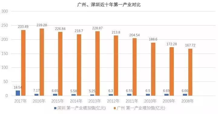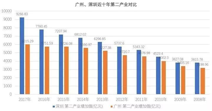 上图是两市第一、第二、第三产业近十年增长情况,从产业分布来看,广州第一产业和第三产业领先于深圳,但第二产业一直不如深圳,而且这几年的差距在拉大。