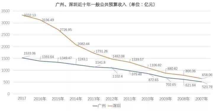 但根据去年的数据,深圳一般公共预算收入3332.13亿元,增长10.1%,广州一般公共预算收入1533.06亿元,增长10.9%,深圳是广州的2倍多。