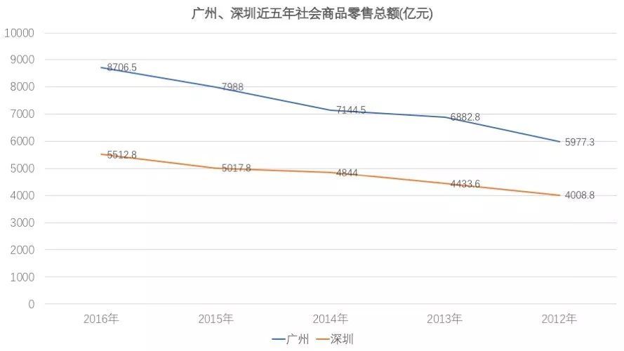 在社会商品零售总额方面,广州一直领先于深圳,这个很好理解,因为广州是中国的商贸之都。