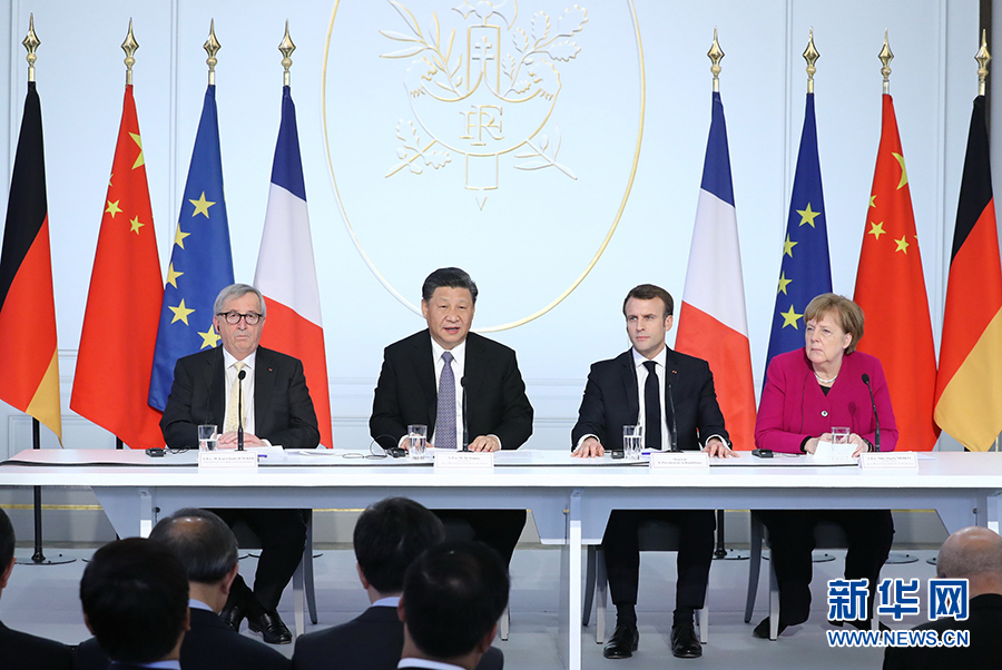 3月26日,国家主席习近平在巴黎同法国总统马克龙一道出席中法全球治理论坛闭幕式。德国总理默克尔、欧盟委员会主席容克应邀出席。 新华社记者 鞠鹏 摄