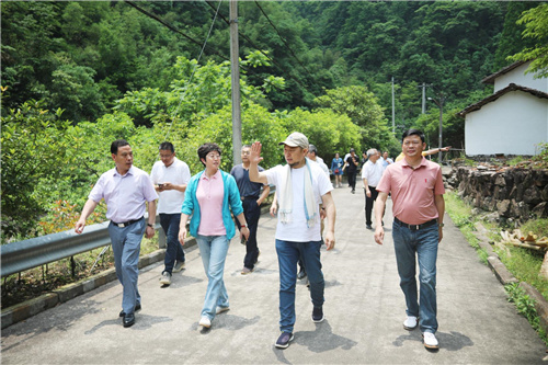 中共金华市婺城区委书记蔡艳(前排左二)陪同著名音乐人陈越(前排左三)考察白沙溪流域。
