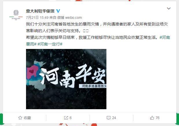 图为意大利驻华大使馆官方微博为河南民众加油
