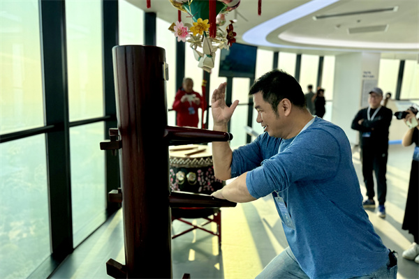 商业新闻网CEO缪国济体验咏春拳文化。 (大公文汇网 记者 李紫妍 摄)