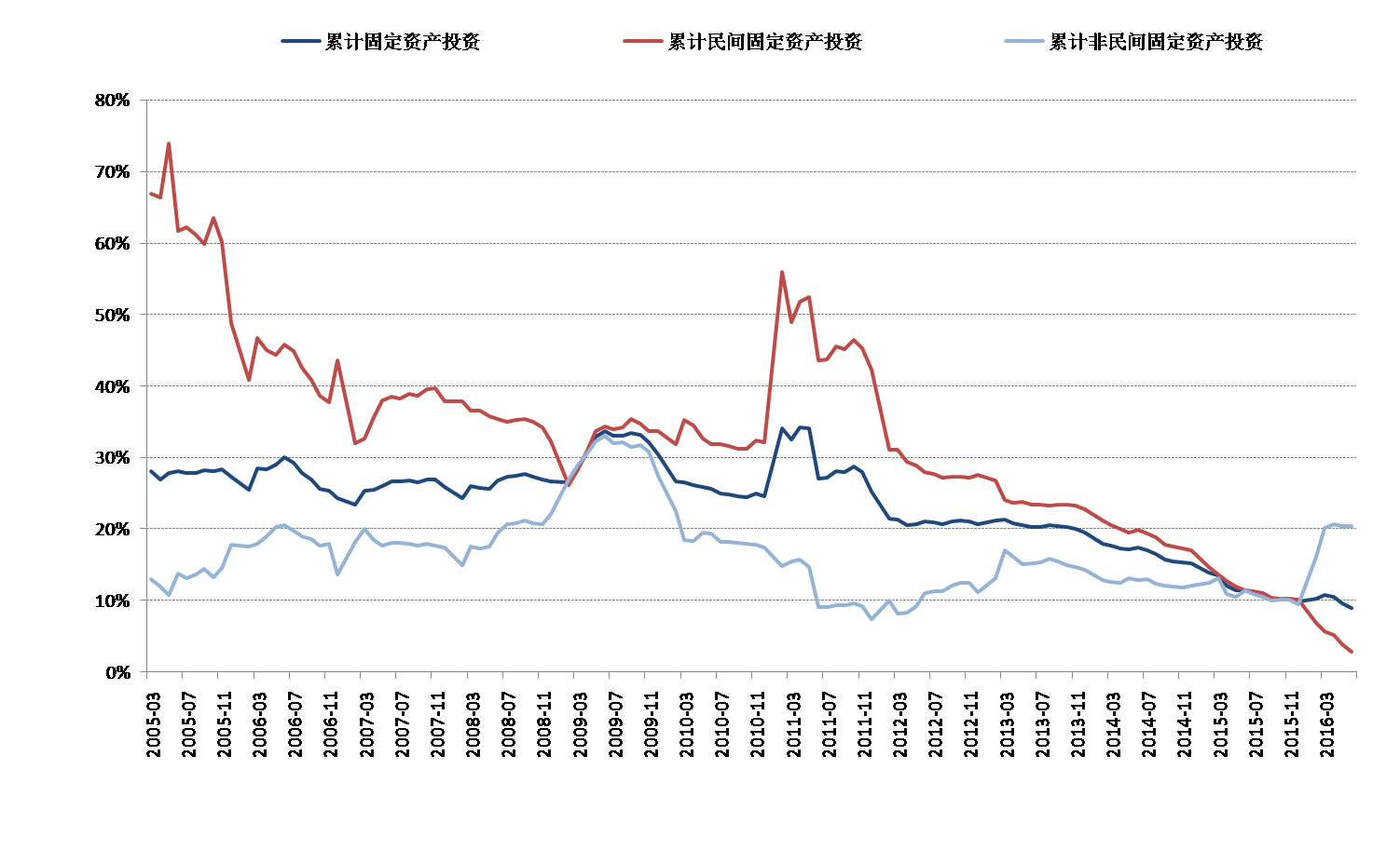 大量研究表明,民营企业投资回报率远高于国企,即使受到信贷歧视,民间投资在改革开放之后的30年时间中一直以远高于国企投资的速度扩张。这一结构化因素,是与FDI大量流进中国同等重要的原因,支持了中国经济快速的产业升级换代与技术水平提升。2012年之后,民间投资增速不断降低,但仍旧高于非民间投资增速,直到2016年。按照最新数据,2016年上半年固定投资增速高达9%,民间投资增速仅为2.8%,非民间投资增速则高达20.4%,其中国有控股投资增速高达23.5%。如果计算当月同比,则民间投资6月份比去年6月零增长。