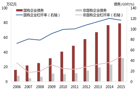 从国际比较来看,中国在整体债务水平上还算不上一个债台高筑的国家,但中国非金融企业部门的债务却冠绝全球。按国际清算银行(BIS)数据,截至2015年第三季度,中国非金融企业部门杠杆率已达166.3%,远高于其他国家。目前,相关机构在估计中国企业债务水平时都没有对企业类型做出区分。我们利用财政部公布的全国国有企业负债数据,对非金融企业部门杠杆率进行拆解后发现:中国非金融企业部门债务主要集中于国有企业。截至2015年底,中国国有企业负债占整体非金融企业负债的比例在70%左右,占GDP的比重高达116.8%。倘若去掉国有企业负债,中国非金融企业杠杆率只剩49.5%。