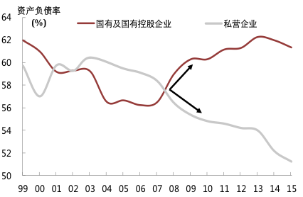在比较不同类型企业杠杆率的演进趋势方面,相较于“债务/GDP”的总量指标,“资产负债率”更能反映出企业资本结构的差异。我们进一步采用工业企业经济效益数据,对国企与非国企的杠杆率演进差异进行更长期的观察。我们发现,中国国企与非国企的杠杆率分化始于2008年。2008年以前,中国国有企业杠杆率长期低于私营企业;2008-2009年全球金融危机期间,中国国有企业杠杆率迅速上升,而私营企业杠杆率快速下降,国企杠杆率开始超过私企;此后,二者持续分化,形成了目前国企资产负债率远高于私企的状况。值得注意的是,2013年以后,国企资产负债率开始掉头向下,但速度远低于私营企业,二者分化格局依旧。截至2015年底,国企资产负债率高达61.4%,而私企资产负债率已降至51.2%。