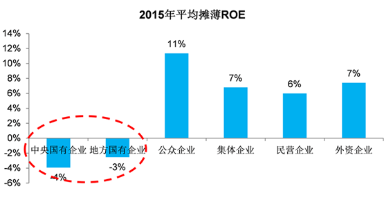 国有企业资产负债率更高,但盈利能力更差,反映资源配置的低效率。从上市公司的情况看,中央国有企业和地方国有企业的平均资产负债率平均比民营企业、外资企业高4-5%,由于背靠政府信用,国有企业更容易从银行体系获得贷款和授信,资金成本也往往更低。但考察盈利能力,以平均摊薄ROE计,无论上市央企还是上市地方国企,2015年平均摊薄ROE均为负值,远低于其他类型的上市公司。尽管这些企业盈利能力差,甚至出现了亏损,中国的银行体系仍然在不断向这些企业“输血”,而一些盈利能力不错的民营企业却仍然求“钱”若渴,金融体系资源配置效率仍然非常低下,改革迫在眉睫。