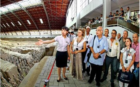 峰会期间,来自52个“一带一路”国家的政府代表、驻华使节、商协会主席,国际组织负责人,以及国内外博物馆馆长和中国工商界企业家嘉宾参观了世界文化遗产“秦始皇兵马俑”,感受了古都长安悠久的历史和厚重的文化魅力 中新社发 王保胜 摄