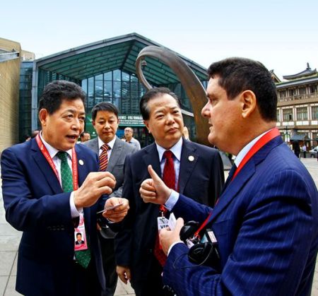 丝绸之路国际总商会主席、中国国际商会副会长吕建中在大唐西市博物馆与参加峰会的外国嘉宾亲切交流 中新社发 王保胜 摄