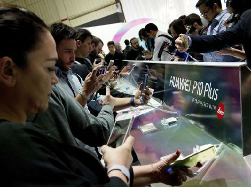 2月26日,在西班牙巴塞罗那举行的世界移动通信大会开幕前,人们试用中国品牌华为新发布的P10和P10 Plus手机。 新华社发