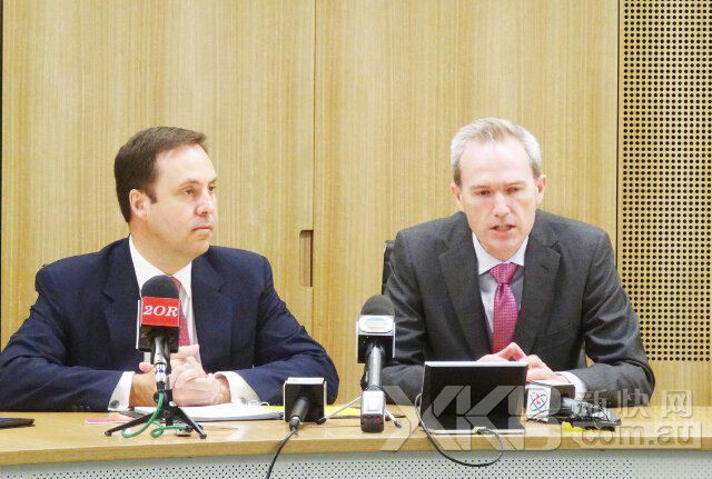 联邦贸易部长西奥波(左)与联邦班克斯选区议员高民。澳洲联邦贸易部长西奥波(StevenCiobo)与澳洲联邦班克斯(Banks)选区议员高民(DavidColeman)周四在悉尼举办了新