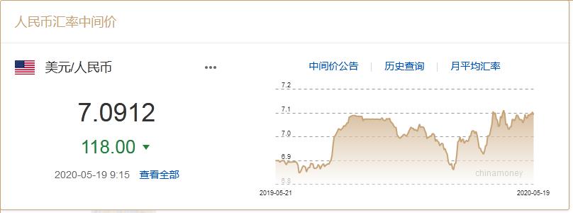 中国外汇交易中心数据显示,5月19日,人民币兑美元中间价调升118个基点,报7.0912。前一交易日人民币兑美元中间价报7.1030。当日,在岸人民币对美元汇率开盘拉升逾10