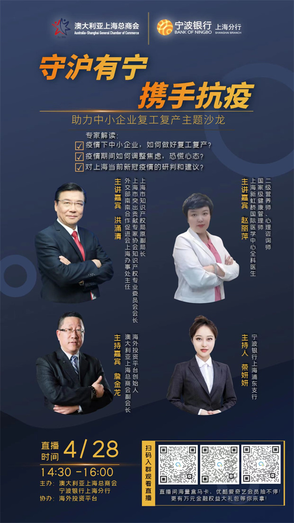 守沪有宁,携手抗疫️ 欢迎您入群收看4月28日下午14:30的“助力中小企业复工复产主题沙龙”公益直播讲座️ 本次活