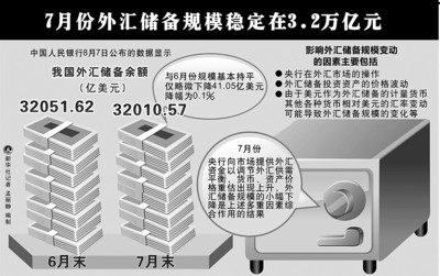 新华社北京8月7日电(记者姜琳)中国人民银行7日公布的数据显示,7月末,我国外汇储备余额为32010.57亿美元,与6月份规模基本持平,仅略微下降41.05亿美元,降幅为0.1%。