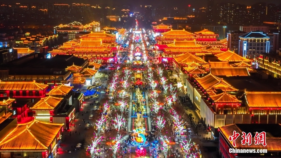 1月16日,陕西西安,临近兔年春节,航拍西安大唐不夜城春节夜景,灯火璀璨流光溢彩。