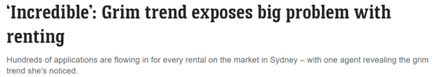 澳洲新闻集团2月13日报道,悉尼每套待租房产都有数百人申请,且绝大多数申请者开出的价格都远超广告价格。报道称,目前全澳的空置率仅为0.9%,创历史新低,租金因此飙