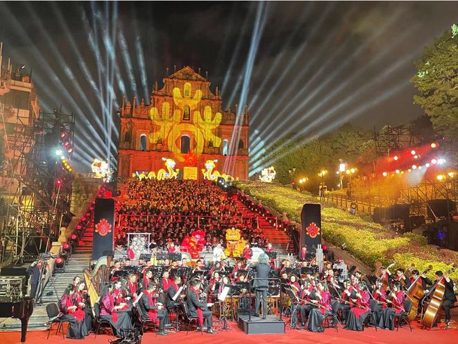 中新社北京2月4日电(记者应妮)3日晚,澳门大三巴牌坊前的广场上,澳门中乐团携手中外艺术家联袂带来《春节序曲》《春舞》《澳门随想曲》等经典乐曲,为2024年“欢乐