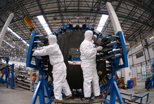 资料图片:中国首架C919大型客机后机身前段验收交付。新华社记者姚剑锋摄美媒称,2015年11月,中国商用飞机有限责任公司(COMAC)在其位于上海的新设施呈现了第一架C9