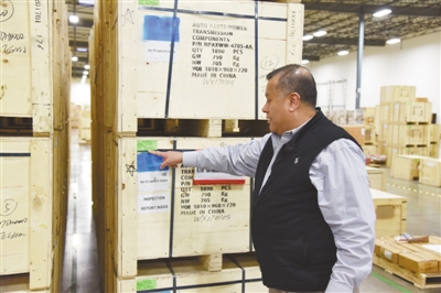 在万向美国公司总部仓库,公司员工赫苏斯介绍从中国运来的货物。记者章念生摄“我准备再干25年再退休!”59岁的赫苏斯·弗罗莱斯是万向美国公司总部的仓库部经理。他