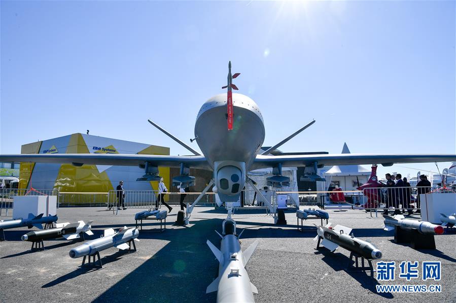 6月19日,在法国巴黎近郊的布尔歇,来宾参观中国航空工业集团公司带来的“翼龙II”无人机模型。第52届巴黎-布尔歇国际航空航天展览会(巴黎航展)19日正式开幕。十余