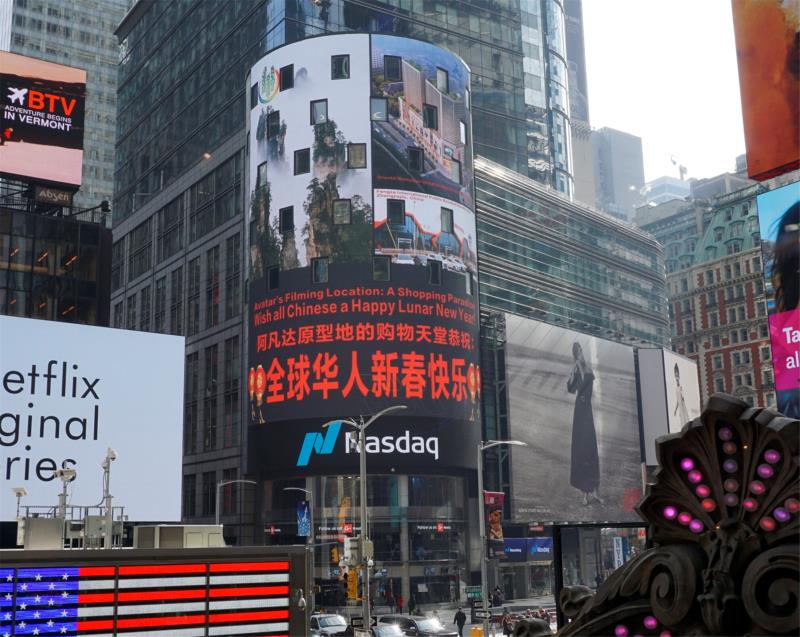 纽约时代广场惊现阿凡达原型地张家界的新春祝福;纽约当地时间2月15日,美国纽约时代广场的纳斯达克大屏幕,滚动播出中英文祝福的宣传片:“阿凡达原型地的购物天堂恭