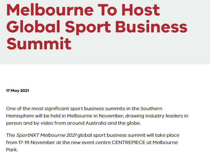 维州政府17日宣布,作为南半球最重要的体育商业峰会之一,2021年SportNXT大会将于11月17日至19日在墨尔本举行。届时,来自澳洲及全球的行业领袖将亲自或通过视频出席