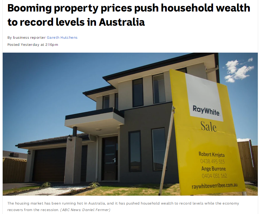 尽管仍有成千上万的人失业,但高涨的房价仍将澳洲的家庭财富推至创纪录的高水平。澳广网25日报道,在2020年的最后3个月,澳洲的住宅地产价值跃升了约2500亿元。在此
