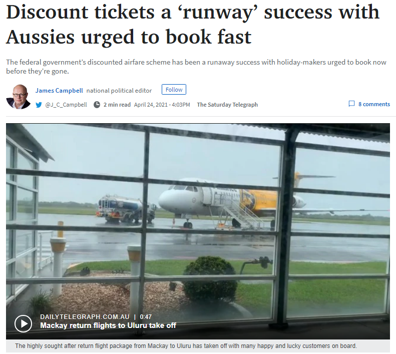热衷于抢购半价机票的澳人们需要抓紧时间了,80万张半价机票中,超过3/4已经卖光了。《每日电讯报》24日报道,自从联邦政府斥资12亿元,支持地区航空和旅游业的半价机