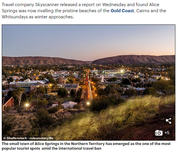 旅游公司Skyscanner28日发布了澳洲最受欢迎的旅行目的地,昆州Whitsundays和HamiltonIsland位居前两名,北领地AliceSprings位居第三名。《每日邮报》报道,由于国际