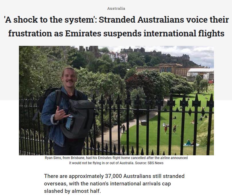 澳洲的国际入境人数上限近日被削减了近一半,目前,约有3.7万名澳人仍被困在海外。在阿联酋航空公司(Emirates)近日证实许多进出澳洲的国际航班被取消后,被困海外的澳人表达了他们对澳洲政府的失望。