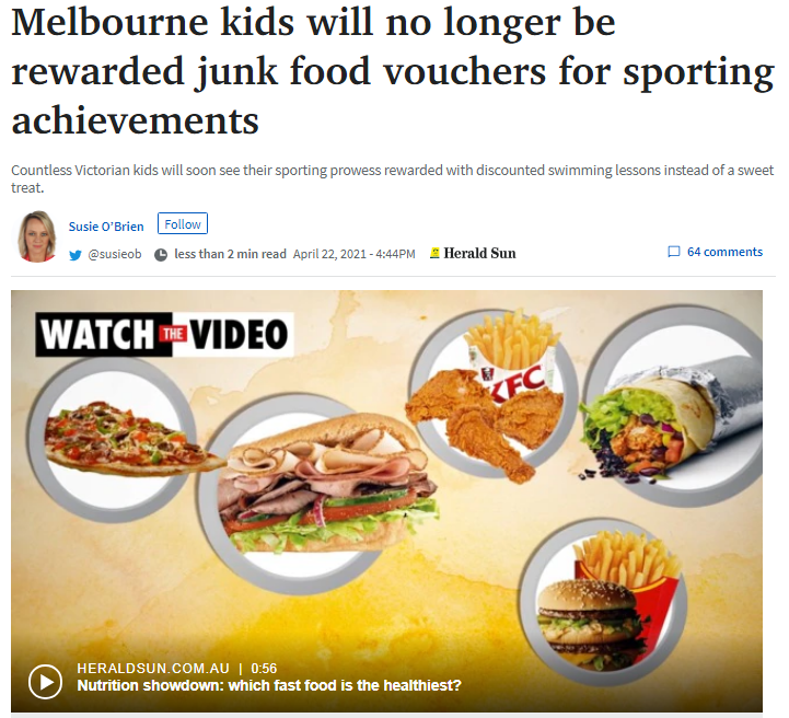 据悉,维州卫生厅和迪肯大学(Deakin University)的一项调查显示,2/3的父母认为孩子的运动奖励也应该是健康的。在接受调查的500名父母中,半数人表示他们的孩子曾经因为运动表现好而获得了快餐券。
