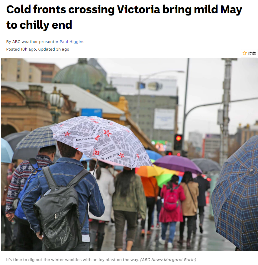 澳广网报道,一系列的冷锋将导致墨尔本今年5月原本反常温暖的天气转向寒冷。德拉蒙特表示:“周六(15日)肯定会出现一股很冷的气团。周边地区也有可能会下小冰雹。”