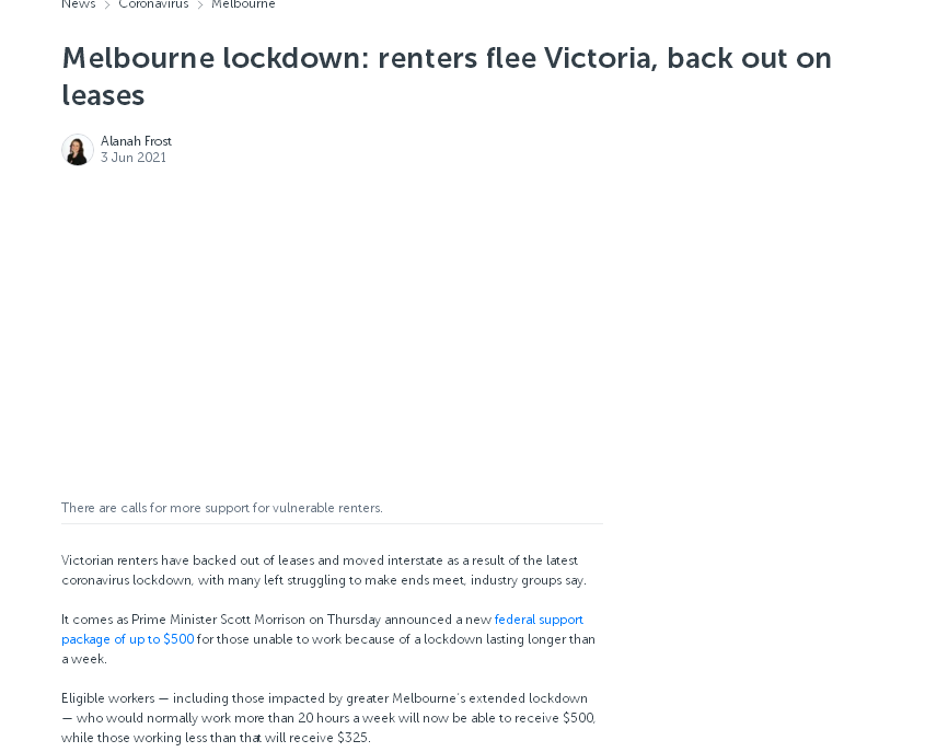 Realestate报道,针对封城一事,总理莫里森(Scott Morrison)已经于3日(周四)宣布了一项新的联邦援助计划,为那些因封城令超过一周而无法工作的人提供最高500元的援助。但Besser and Co的合伙人、物业管理主管戴伯纳(Marcel Dybner)表示,尽管这笔付款是朝着正确方向迈出的一步,但它可能只是弥补租金成本,让租房者在其他生活成本中挣扎。他说,他们已经和一些难以支付房租的租客谈过了,其中一些人已经开始考虑搬离维州。