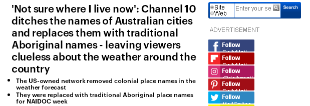 第10频道(Channel10)4日晚在天气预报中把澳洲城市的英文名称换成了传统原住民的名称,旨在吸引更年轻、“崇尚社会进步”的观众。据悉,此举也是为了庆祝NAIDOC原住民活动周开始,该活动从7月4日持续到11日。
