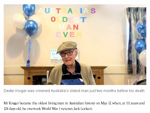 澳洲最长寿的老人克鲁格(Dexter Kruger)在111岁188天的时候去世了,这位出生于1910年的老人在两个月前刚刚庆祝成为澳洲的最长寿老人。