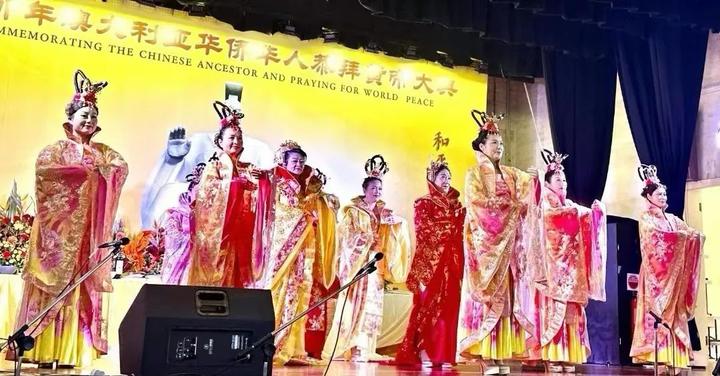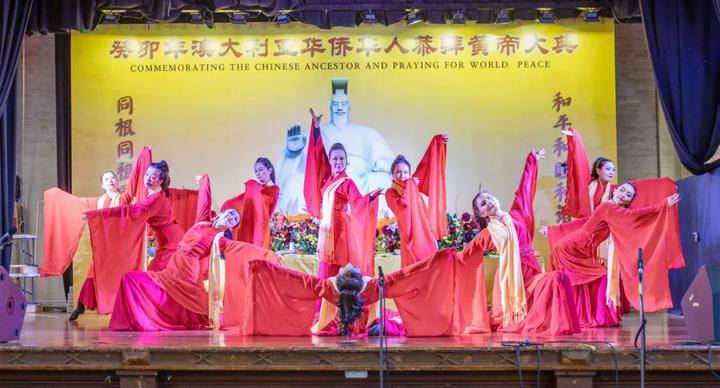 接下来,身着红色汉服的舞蹈演员跳起了中国传统的民族舞。载歌载舞是节日不可缺少的元素,澳大利亚东方歌舞团演员们的优雅舞姿如飘飘仙女,描绘出一副美丽祥和的画卷。第七项仪程《乐舞敬拜》表达炎黄子孙对先祖的敬意和爱戴。