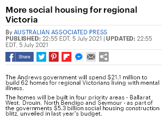 住房将优先在BallaratWest,Drouin,NorthBendigo和Seymour四个地区建造,这是维州政府在去年的预算案中公布的53亿元公益住房(socialhousing)建设“闪电战”的一部分